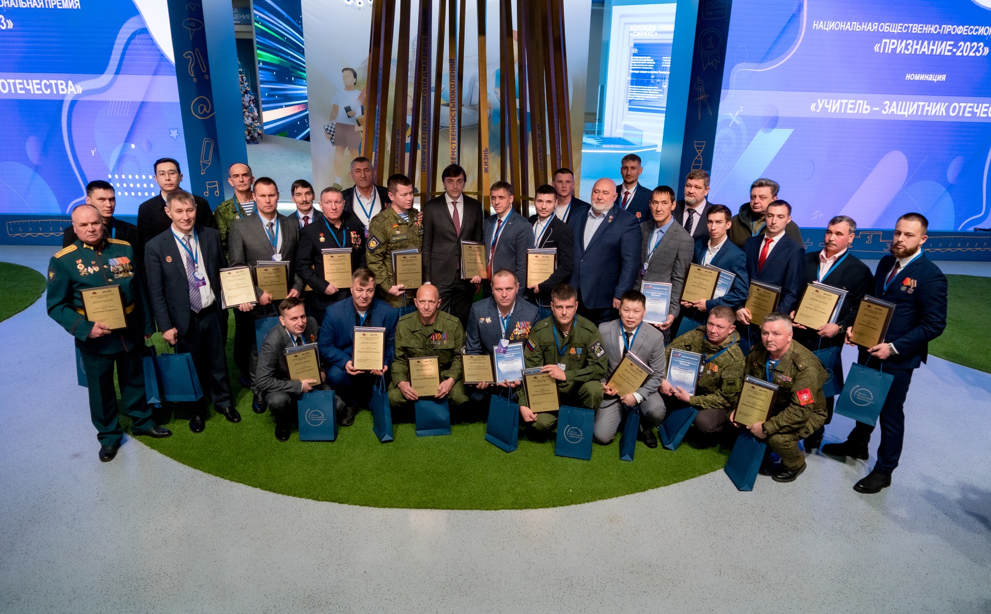 Министр просвещения Российской Федерации Сергей Кравцов вручил награды лауреатам Национальной общественно-профессиональной премии «Признание-2023» в номинации «Учитель – защитник Отечества». Ими стали 29 педагогов, принимавших участие в специальной военной операции. Награждение состоялось в рамках торжественной церемонии открытия III Всероссийского педагогического образовательного форума «Учитель – Будущее России» на Международной выставке-форуме «Россия» в павильоне № 57 Министерства просвещения Российской Федерации.