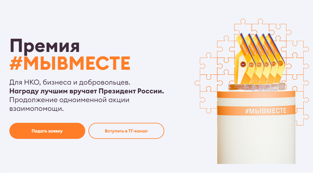 Успевайте подать заявку до 15 мая на премия.мывместе.рф. Представьте свой регион, заявите о проекте на всю страну и запустите цепочку добрых дел!