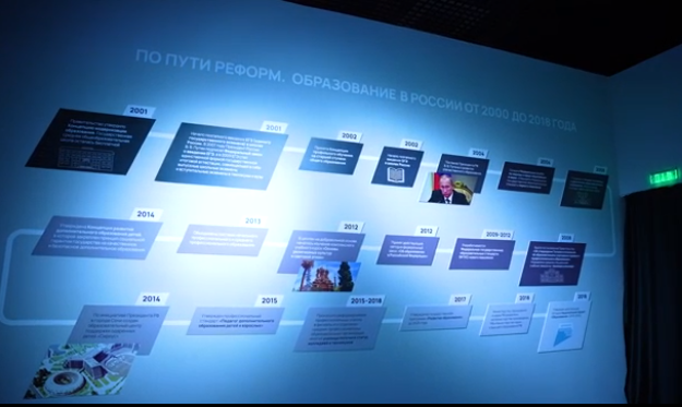Экспозиция содержит зоны «Детский сад» и «Школа» с тематическими «кабинетами» и развивающим пространством для ребят разных возрастов. В залах «Урок географии», «Урок истории», «Урок родного языка» транслируются образовательные материалы, в предметных зонах размещены новые учебники истории, карта уникальных школ России.