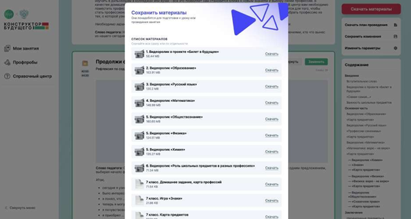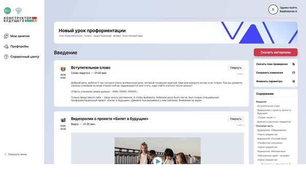 Один из продуктов платформы – «Конструктор будущего», разработанный командой Проектории. Это уникальный онлайн-инструмент для педагогов, который позволяет просто и быстро формировать профориентационные занятия. Педагогу нужно только задать необходимые параметры: тип занятия, возраст учеников, тематика занятия – и Конструктор сформирует готовый сценарий, включая все необходимые мультимедийные материалы – игры, анкеты, чек-листы презентации и видеоролики. Некоторые из них основаны на интервью со специалистами из крупных компаний — например, VK, РЖД или «Росатома». Всего создатели провели больше 90 интервью.
